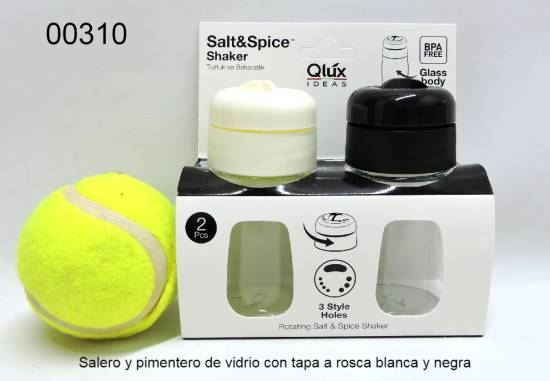 SALERO Y PIMENTERO DE VISRIO CON TAPA A ROSCA BLANCA Y NEGRA 1.25